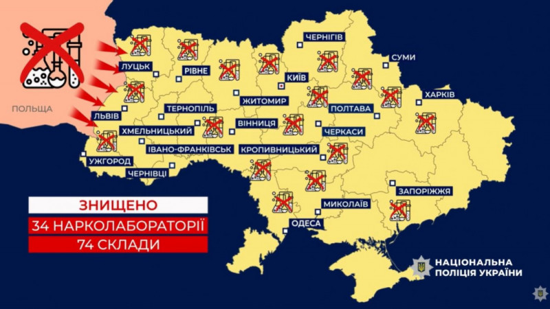 У ході проведення слідчих дій правоохоронці задокументували діяльність та ліквідували ключові елементи злочинної інфраструктури – 34 нарколабораторії та 74 склади.