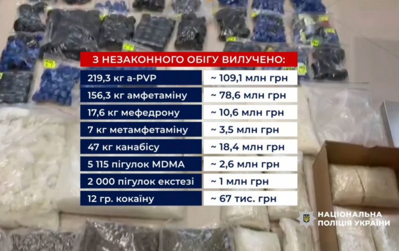 За результатами вилучено: 220 кг alpha-PVP, 156 кг амфетаміну, 17,6 кг мефедрону, 7 кг метамфетаміну, 47 кг канабісу, 7 тисяч пігулок MDMA, 46,6 кг та 284 л фенілнітропропену, а також понад 20 тонн прекурсорів, з яких можна було б виготовити більше 4 000 кг «готової продукції», 41 автомобіль, гроші в національній та іноземній валюті на загальну суму, еквівалентну понад 10 мільйонів гривень та арештовано віртуальних активів на суму 45 000 USDT, а також вилучено зброю та набої до неї, лабораторне обладнання, мобільні телефони, банківські картки, чорнові записи.