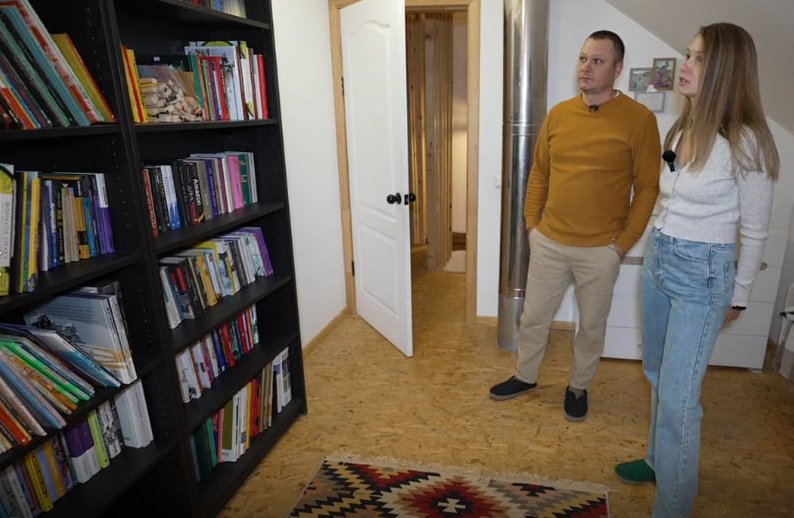 В інтер'єрі будинку поєднали старі балки, щоб зберегти історію будівлі, а перший поверх не змінювали. На другому – зробили кімнати для дітей: двоярусне ліжко Вадим змайстрував власноруч, а ще один син спить у кімнаті з каміном, де взимку дуже тепло. Також у кімнаті сина зберігають книги зі свого колишнього магазину, який закрили.