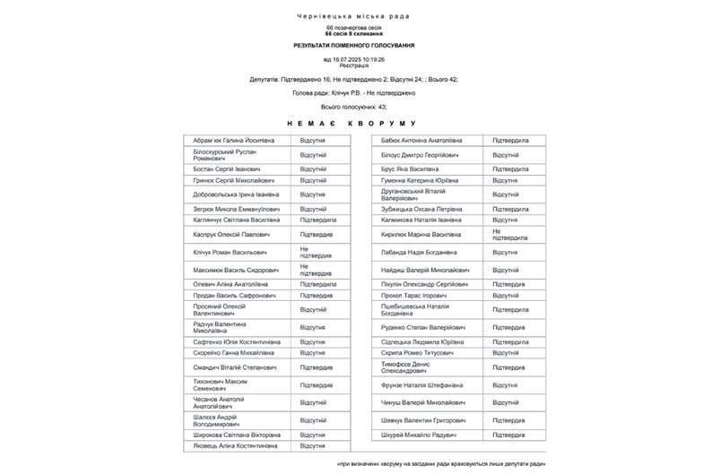Перелік депутатів, які прийшли та які були відстуніми на позачерговій сесії Чернівецької міської ради 16 липня 2025 року. Скріншот/Чернівецька міська рада