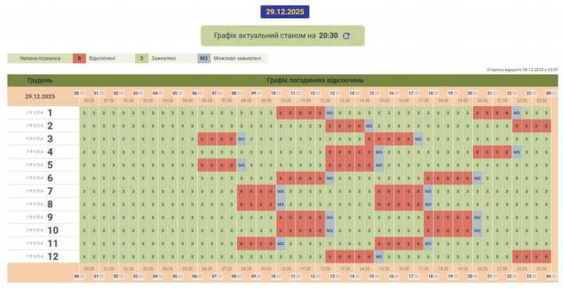 29 грудня, у переважній більшості регіонів України будуть діяти графіки погодинних відключень електропостачання для населення. Час дії та тривалість обмежень визначатиметься залежно від конкретного регіону.