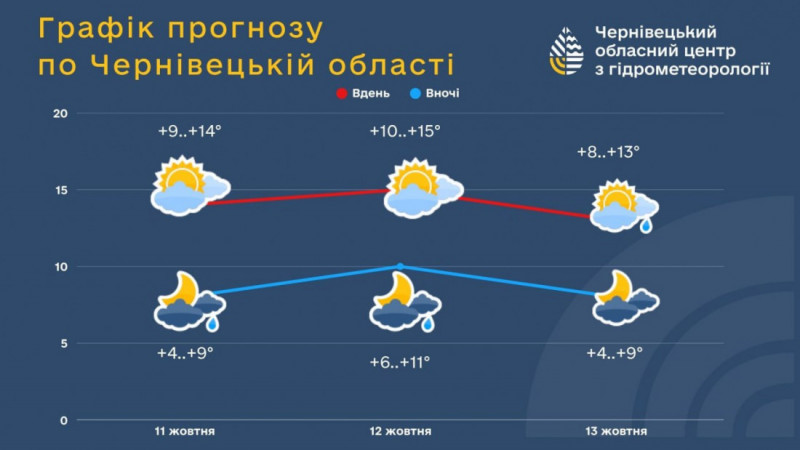 Починаючи від 14 жовтня на тлі проходження холодного фронту з північного заходу, у більшості областей вночі температура знизиться до +2-8°С, вдень обіцяють від +6°С до +13°С.