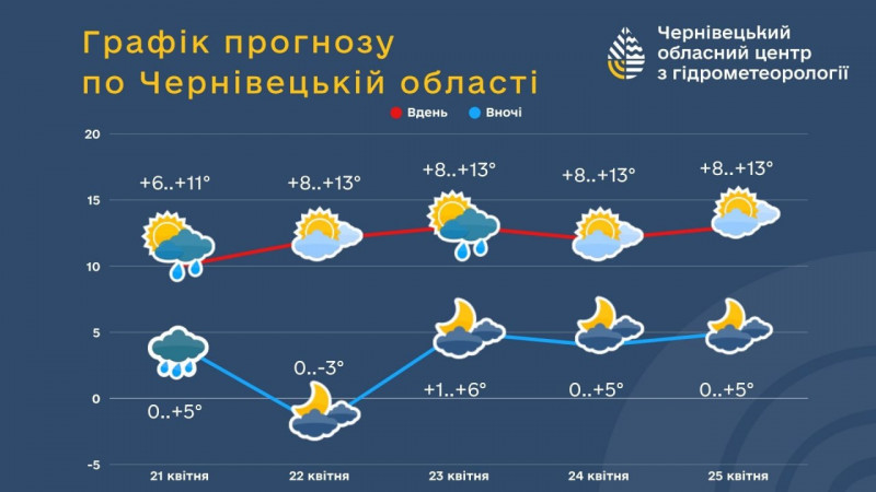 Нічні температури у ці дні становитимуть 0-5° тепла, лише 22 квітня заморозки у повітрі 0-3°, в горах 0-5° морозу, вдень же повітря прогріватиметься до 8-13° тепла.