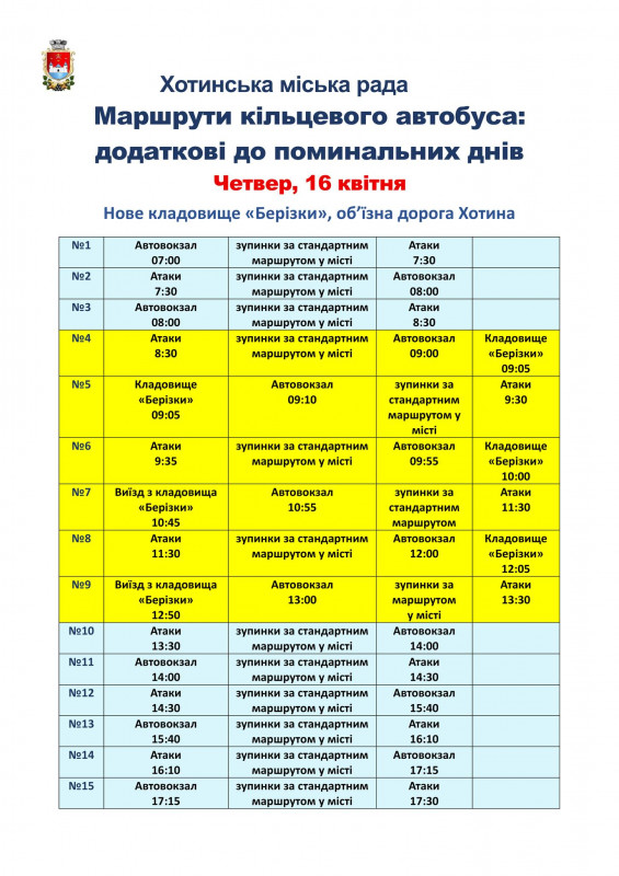 У ці дні автобус курсуватиме до нового кладовища з Алеєю слави, що на об’їзній у Хотині, до кладовища "Ланок" і кладовища на вулиці Українській.