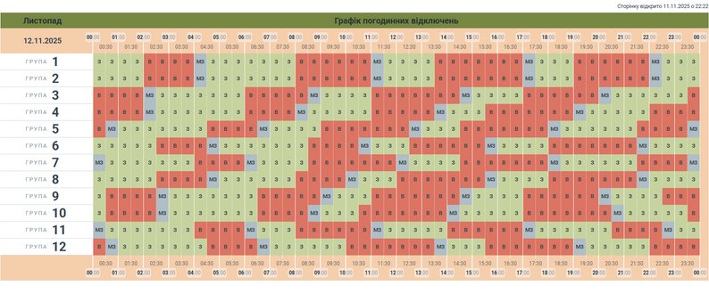 Графік погодинних відключень електрики на 12 листопада 2025 року у Чернівцях. АТ “Чернівціобленерго”
