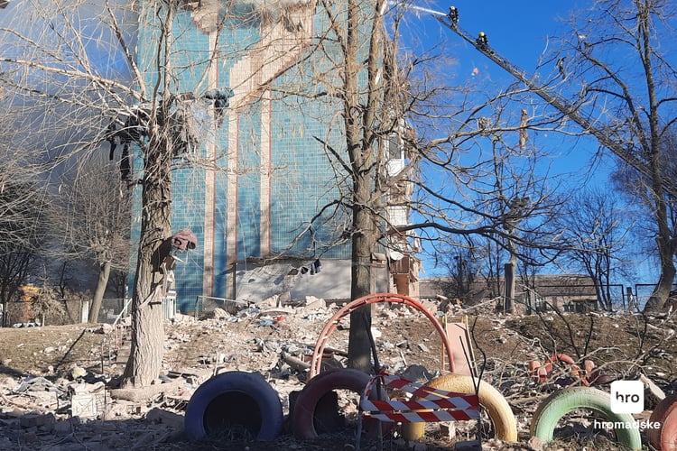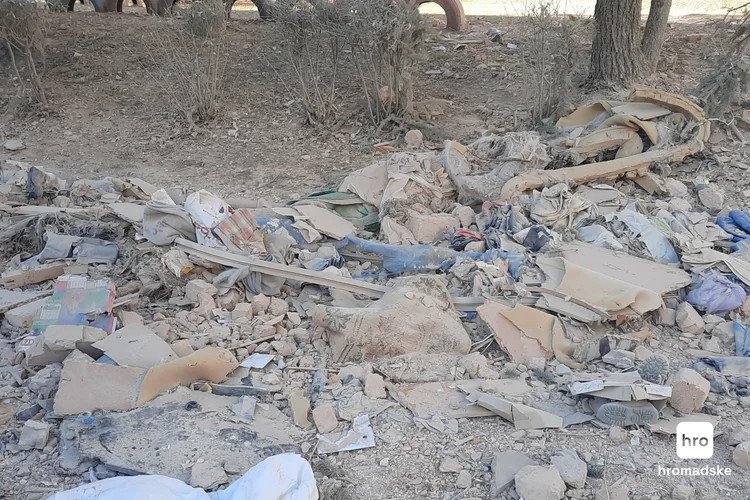 Біля зруйнованого будинку вже почали скупчуватися люди. Від удару ракети частина дому впала на територію дитячого садочка. Під ногами валялися дитячі куртки, чобітки, іграшки та сторінки із книжок. На одному із дерев висів обгорілий та порваний старий радянський килим. Одна з жінок ходила і щось прискіпливо шукала серед цих уламків.