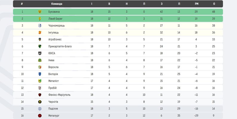 Турнірна таблиця Першої ліги після 18 туру. Скріншот з офіційного сайту ПФЛ
