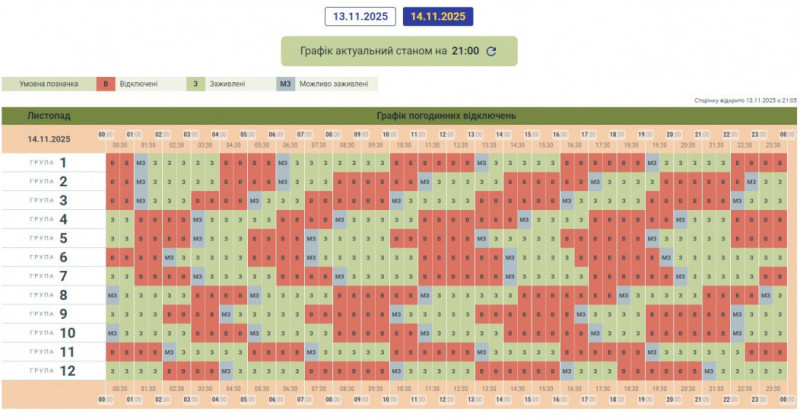 По всій території України у пʼятницю, 14 листопада, всю добу будуть задіяні погодинні відключення електроенергії, повідомляє Міненерго.