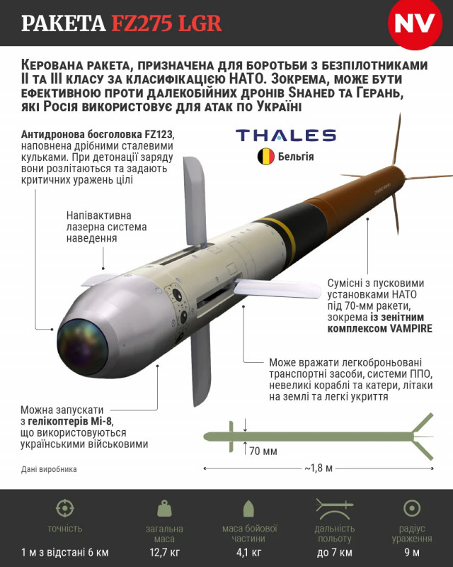 Бельгійська компанія Thales Belgium планує до кінця цього року виготовити приблизно 3500 антидронових 70-мм ракет FZ275 LGR. Ці ракети українська армія використовує для боротьби з російськими шахедами та Герберами.