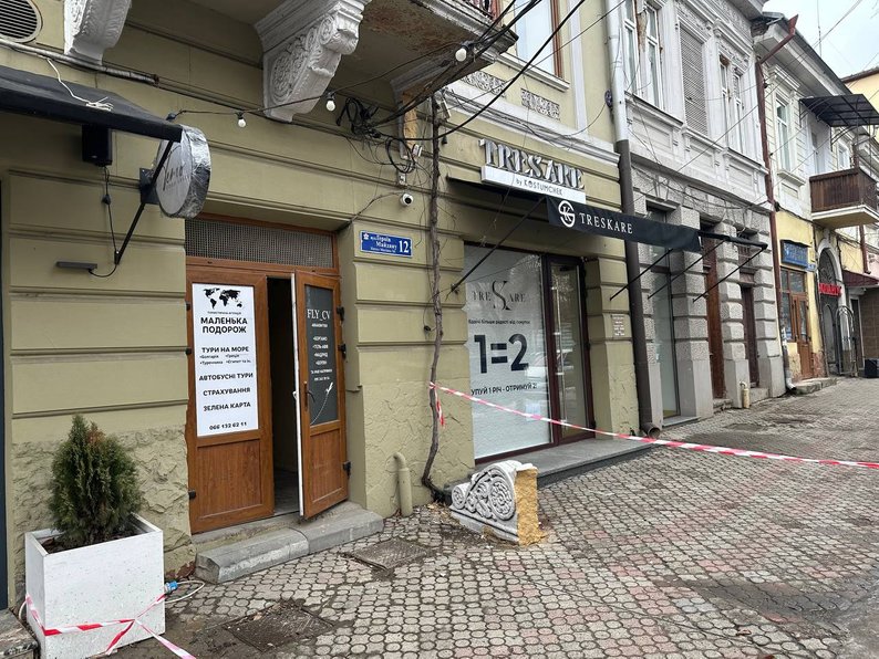 На вулиці Героїв Майдану, 12 у Чернівцях впав балкон, частина якого напередодні обвалился. На фасаді будівлі залишилася металева частина, а залишки декоративних кронштейнів забрали на зберігання підрядники, який прибирають вулицю.