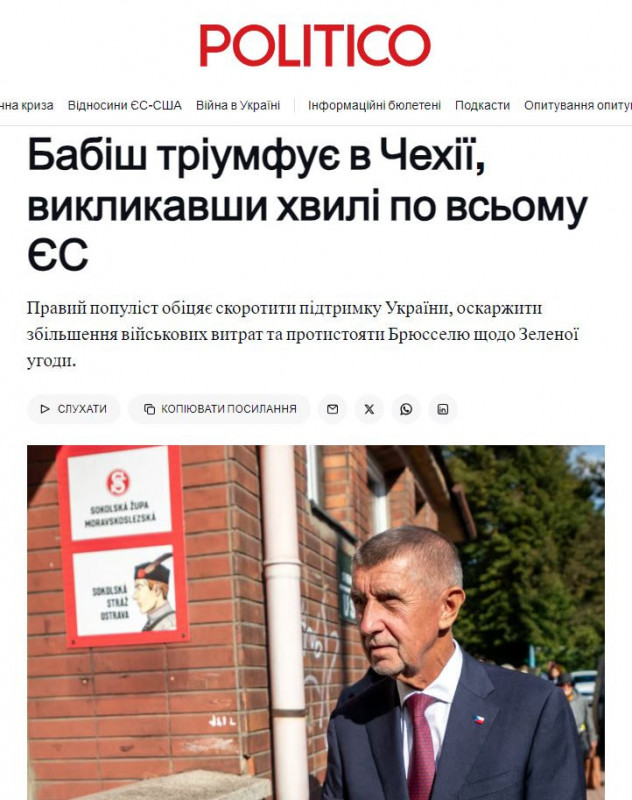 «Я вважаю, що якщо ми подивимося на його заяви та його союзників у Європі, таких як Віктор Орбан та те, що він зробив з Угорщиною, він [Бабіш] почне відштовхувати Чеську Республіку на узбіччя», – заявив міністр закордонних справ Чехії Ян Ліпавський виданню POLITICO.