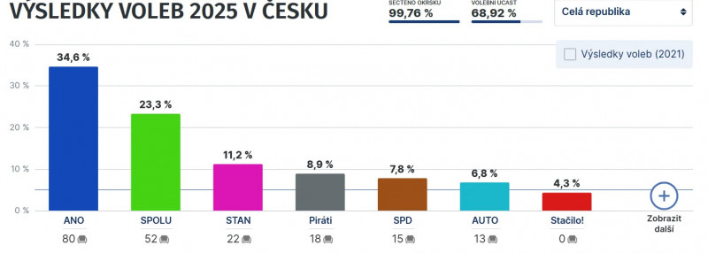 Чеське видання IDNES повідомляє, що пораховано вже 99,76% голосів. За попередніми даними, партія ANO набирає 34,6% підтримки. На другому місці – Spolu (23,3%).