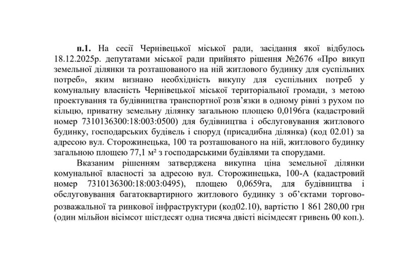 На грудневій сесії депутати підтримали рішення про викуп приватної ділянки на вулиці Сторожинецькій, 100-А площею 196 квадратних метрів з житловим та господарськими будівлями на ній. Вартість цієї ділянки – понад 1,8 мільйона гривень. Водночас викуп передбачає укладання договору міни – власнику віддадуть рівноцінну ділянку.