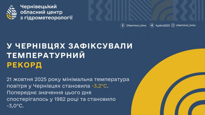 21 жовтня 2025 року, мінімальна температура повітря у м. Чернівці становила -3,2°С. Попереднє значення спостерігалось у 1982 році та становило – 3,0°С морозу.