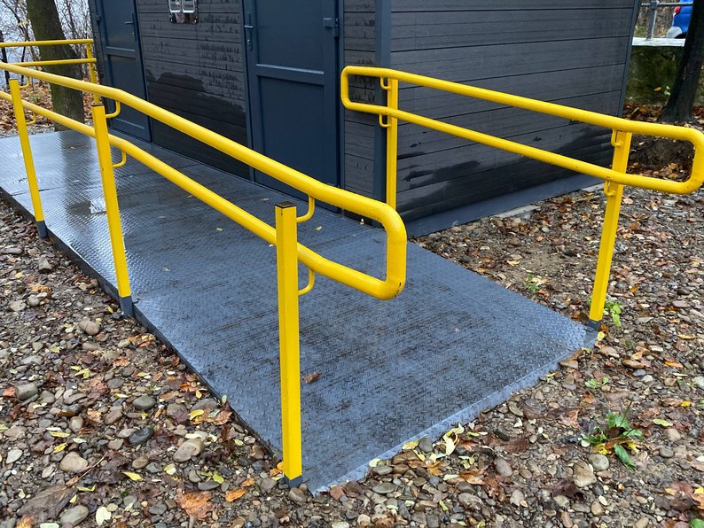 Для людей з інвалідністю передбачили пандус та окрему інклюзивну кабіну, яка також обладнана сповивальним столиком для малюків.