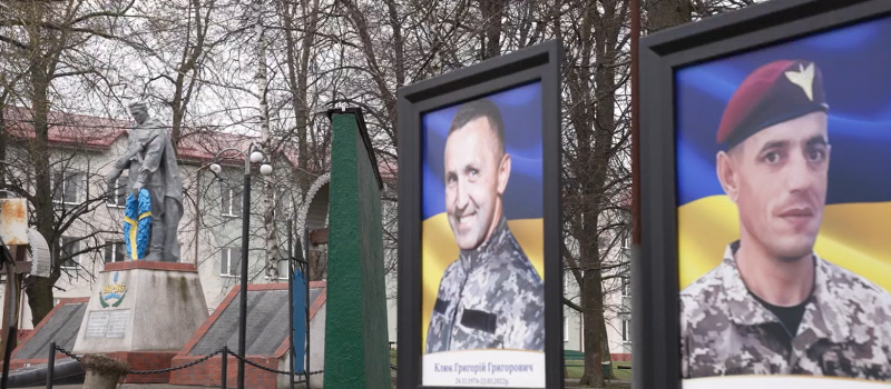 Фото полеглих військових на Алеї Слави та пам’ятник на фоні у Рукшині. Суспільне Чернівці