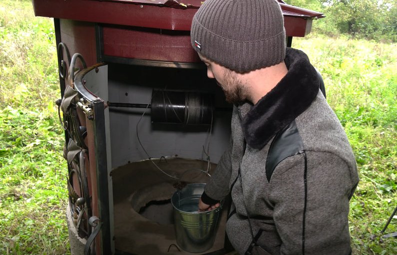 Військовослужбовець Северин Молодяну набирає воду з криниці, яку рідні викопали, поки він був у полоні. Суспільне Чернівці