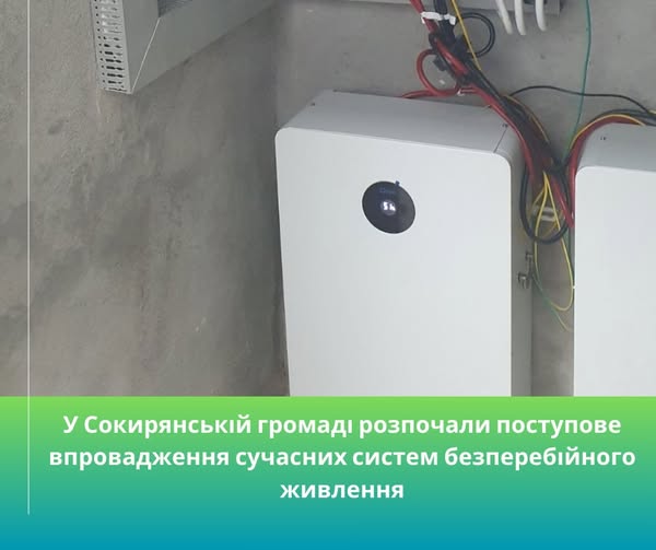 У трьох установах соціального призначення громади — Центрі надання адміністративних послуг (Центрі Дії) Сокирянської міської ради, закладі дошкільної освіти села Романківці та Вітрянській гімназії — встановлено сучасні джерела безперебійного живлення (ДБЖ) з акумулюванням електроенергії.