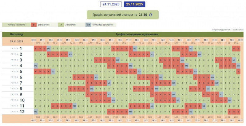 Графік погодинних відключень 25 листопада
