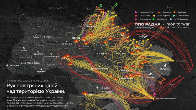У ніч на 03 лютого (з 18:00 02 лютого) противник здійснив комбінований удар по Україні із застосуванням ракет різних типів повітряного, наземного базування та ударних БпЛА. Усього радіотехнічними військами Повітряних Сил зафіксовано 521 засіб повітряного нападу: