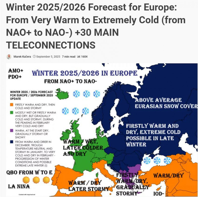 Згідно з прогнозом, прийдешня зима в Європі буде нестабільною та холодною. У грудні очікується волога й штормова погода, тоді як лютий може принести рекордні морози та сильні сніжні бурі. Наприкінці сезону можливе тривале похолодання, яке охопить регіони від Скандинавії до Балкан і Центральної Європи.