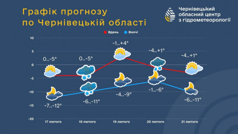 Нічні температури знижуватимуться до 11°морозу, денні становитимуть 0-5°, дещо тепліше буде вдень 19 лютого – до 4°тепла. Переважатиме північно-західний вітер 7-12м/с, 19-20 лютого місцями пориви 15-20 м/с.