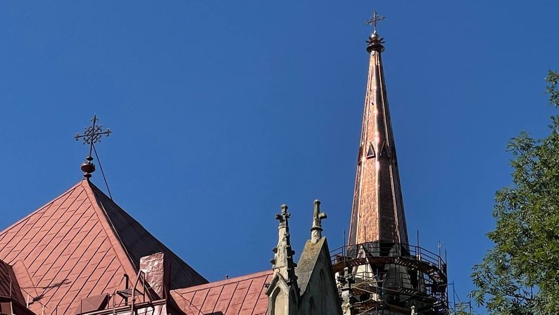 “Мідь може служити до 300 років”. У Чернівцях завершують реставрацію шпилю єзуїтського костелу