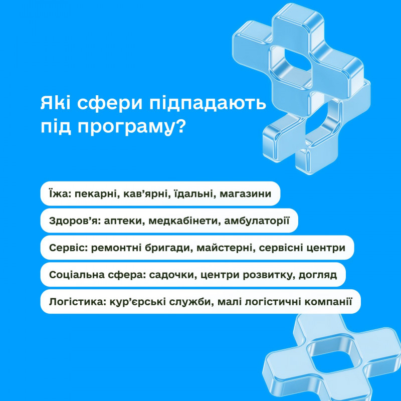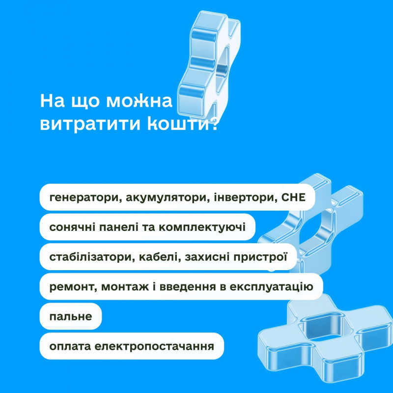 Підтримка надається у формі безповоротної фінансової допомоги для малого бізнесу на покриття витрат, пов’язаних із роботою в умовах відсутності світла та тепла. Отримати кошти можуть підприємці, які забезпечують населення базовими товарами чи послугами та зберігають робочі місця.