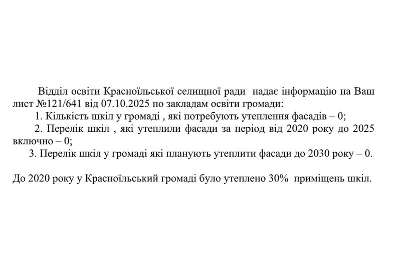 Відповідь на запит Красноїльської громади щодо утеплення фасадів у школах. Суспільне Чернівці