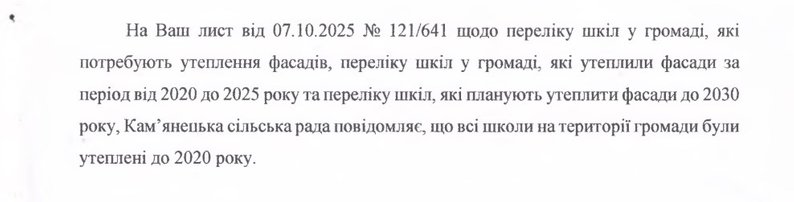 Відповідь на запит Кам’янецької громади щодо утеплення фасадів у школах. Скріншот відповіді на запит
