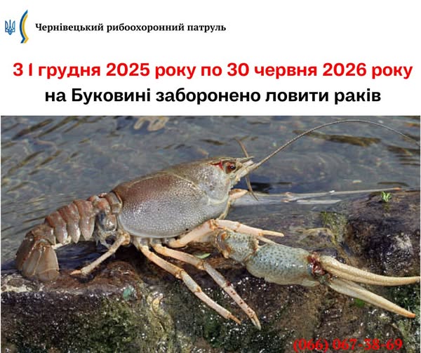 З 1 грудня 2025 по 30 червня 2026 року встановлюється заборона на вилов раків в рибогосподарських водних об’єктах у районі діяльності Чернівецького рибоохоронного патруля.