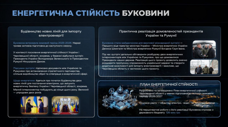 Як пише Суспільне, наразі у Чернівецькій ОВА працюють над двома проєктами енергетичної стійкості: це дві нові лінії для постачання електрики з Румунії.
