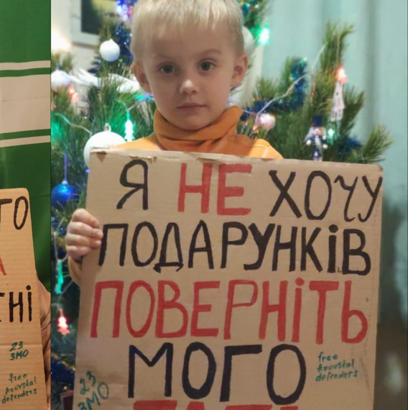 Оля цю реліквію ретельно зберігає, бо для сім’ї вона цінна. Без сумніву, у родинну історію увійдуть і фото з заходів на підтримку військовополонених, на які вони ходили разом. Серед них світлина з акції “Друге Різдво у полоні”, де на фоні фотографії морського прикордонника Сергія Золотарьова його син Михайло тримає плакат: “Я не хочу подарунків. Поверніть мого тата”