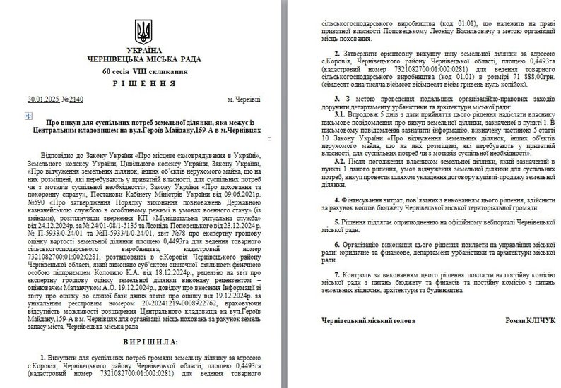 Рішення сесії Чернівецької міської ради про викуп землі на кладовище у селі Коровія. Скріншот/Чернівецької міської ради