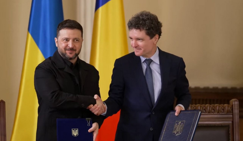 Президент України Володимир Зеленський перебуває у Румунії. На цю хвилину Володимир Зеленський і президент Румунії Нікушор Дан вже підписали низку двосторонніх документів.