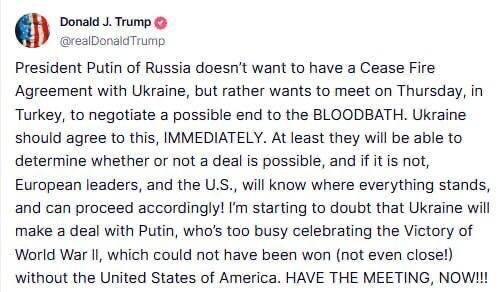 “Україна повинна погодитися на це негайно. Принаймні, вони зможуть визначити, чи можлива угода, а якщо ні, то європейські лідери й США знатимуть, де все знаходиться, і зможуть діяти відповідно! Я починаю сумніватися, що Україна укладе угоду з Путіним, який надто зайнятий святкуванням перемоги у Другій світовій війні, яку було б неможливо виграти (навіть близько!) без США. ЗУСТРІЧАЙТЕСЯ ЗАРАЗ!!!”, – написав глава Білого дому.