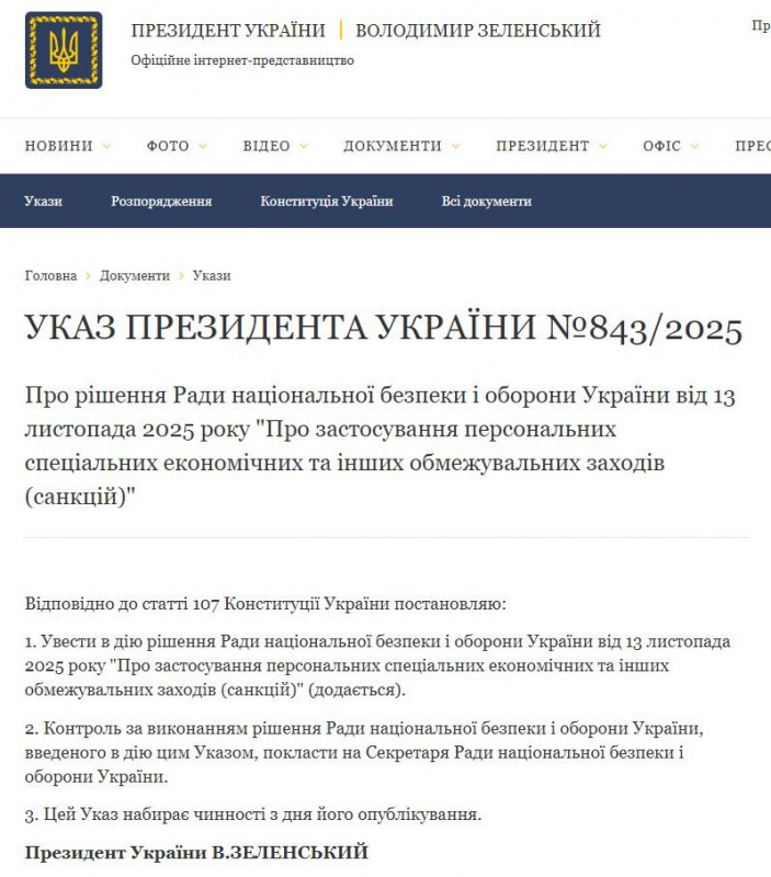 Президент Володимир Зеленський підписав указ про введення санкцій проти Тимура Міндіча та Олександра Цукермана, яких підозрюють у відмиванні коштів у рамках справи про розкрадання в «Енергоатомі».