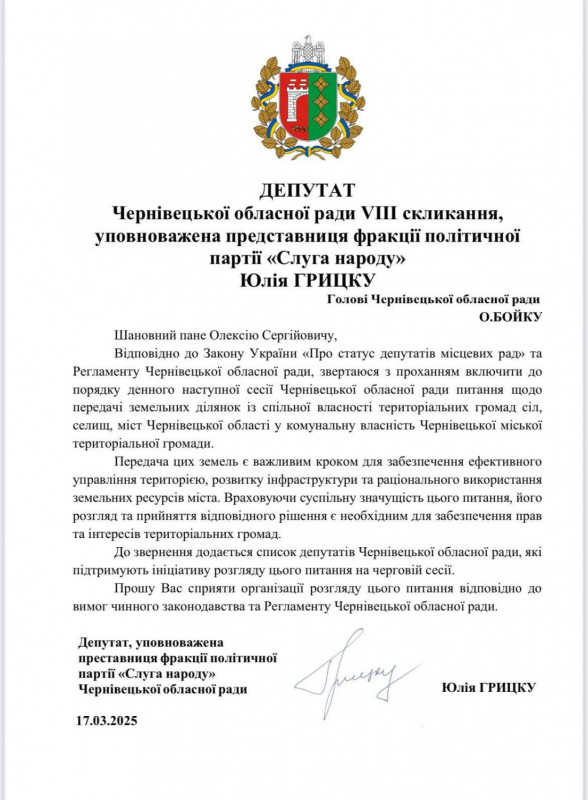 «Через деструктивну і недобросовісну поведінку (?!) голови Чернівецької обласної ради тривалий час не вдається досягти вирішення питання з комунальними землями. Передача цих земель є важливим кроком для ефективного управління територією», — закидала Бойкові керівниця фракції Слуг народу Юлія Грицку-Андрієш.