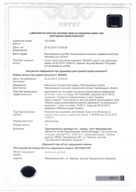 У 2014 році, 24 лютого, державна реєстраторка від мін’юстівських структур Анжела Максимчук реєструє в Державному реєстрі речових прав на нерухоме майно право власності на вже згадану ділянку в Чернівцях на Грушевського, 1 за територіальними громадами міст, сіл, селищ Чернівецької області в особі Чернівецької обласної ради, там же зазначаючи про всяк випадок якусь фантомну територіальну громаду.
